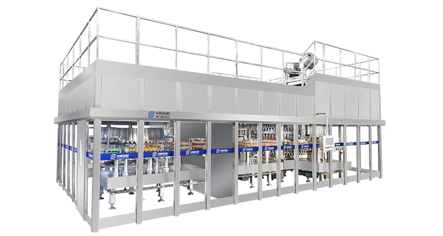 包括吹灌旋一體機(jī)、混合機(jī)、液位檢測、冷溫瓶機(jī)/隧道殺菌機(jī)、貼標(biāo)機(jī)/套標(biāo)機(jī)、吹干機(jī)、噴碼機(jī)、膜包/箱包包裝機(jī)、碼垛機(jī)、纏繞機(jī)、輸送系統(tǒng)、電氣控制系統(tǒng)等在內(nèi)的一整套灌裝包裝生產(chǎn)線。