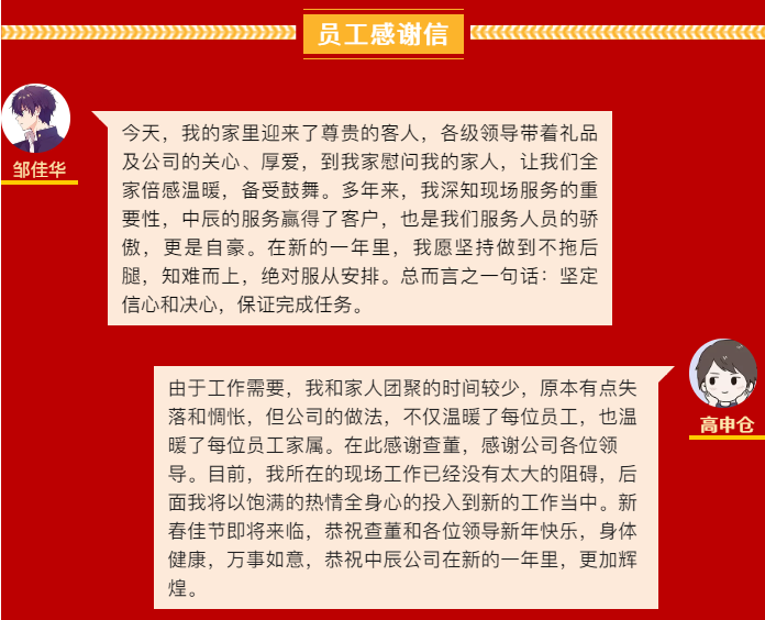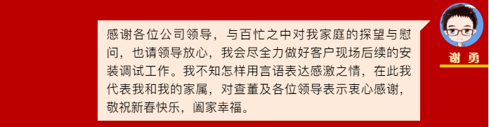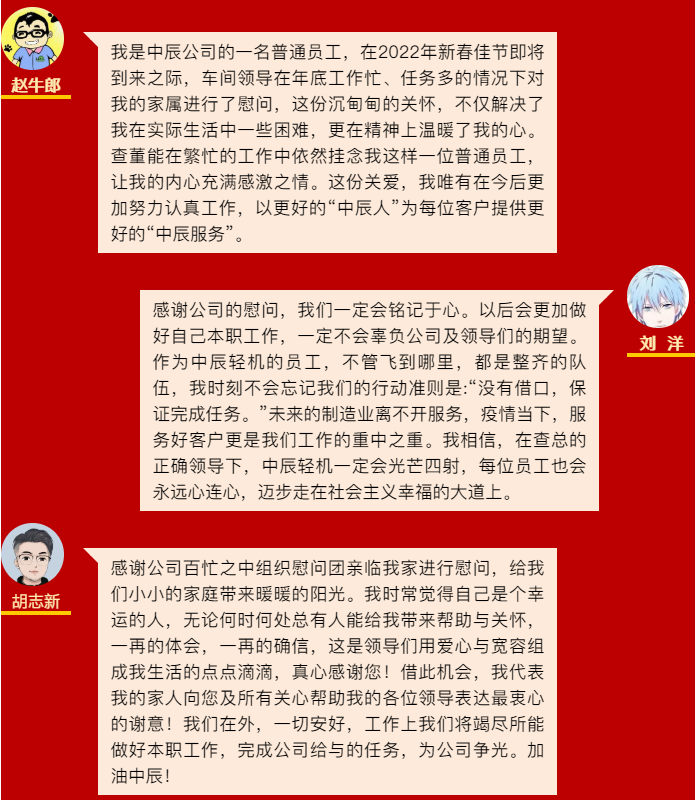 The Party committee, trade union, and leaders of various departments of Zhongchen Light Machinery visited and expressed their New Year greetings to the families of employees who were working at clients' sites to install and debug equipment, bringing them the care and greetings of the organization. This warmth at the end of the year and the beginning of the year made the employees and their families who were fighting on the front line of clients feel relieved and greatly boosted and solidified the work confidence of all cadres and employees. Many of them sent thank-you letters to Chairman, President, and General Manager Zha Zhengwang. In the letters, they expressed that they would practice the corporate culture of Zhongchen Light Machinery and embody the work philosophy of "loving Zhongchen Light Machinery is loving oneself, and loving oneself means loving Zhongchen Light Machinery" in their actual work.