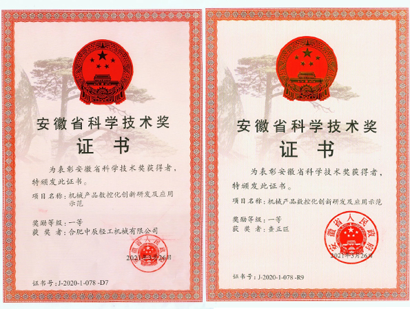 Recently, Zhongchen Light Machinery has received a prestigious honor certificate. The "Mechanical Products CNC Innovative R&D and Application Demonstration" project co-developed by Zhongchen Light Machinery and Hefei University of Technology was awarded the "Anhui Provincial Science and Technology Award" first prize by the Anhui Provincial Government. Meanwhile, one of the project leaders, Zhongchen Light Machinery Chairman Zhao Zhengwang, was awarded the "Anhui Provincial Science and Technology Award" first prize by the Anhui Provincial Government.