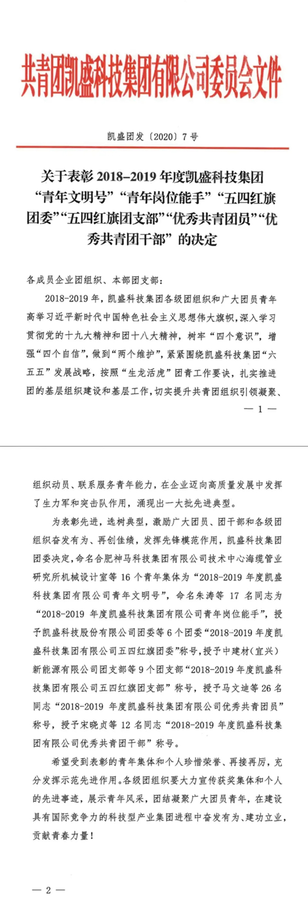 On April 28, KaiSheng Technology Group Co., Ltd. issued a decision to honor the "Youth Civilization Number," "Youth Skilled Worker," "Five-Four Red Flag Youth League Committee," "Five-Four Red Flag Youth League Branch," "Outstanding Young Communist League Member," and "Outstanding Young Communist League Cadres" of the KaiSheng Technology Group for the period from 2018 to 2019. ZhongChen Light Machinery's youth organization won many honors.