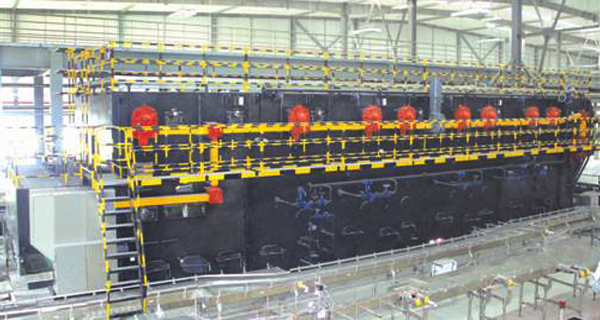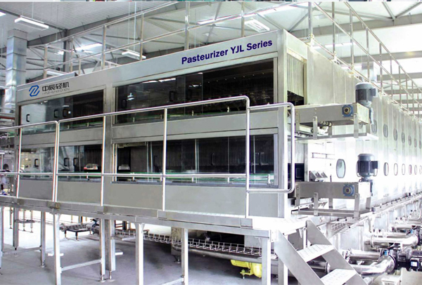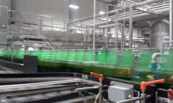 Zhongchen Light Industry Machinery supplies a double-end deep groove washing machine for this project, with the inlet and outlet ends being separate, achieving separation of dirty and clean bottles and reducing the risk of contamination of clean bottles; the main transmission uses a SEW variable-speed motor, which can be adjusted in speed through frequency conversion, and the in-and-out bottle transmission is synchronized with the main transmission through the electrical system; the machine is equipped with multiple overload safety protection devices to ensure safe and stable production; the machine is equipped with 3.5 continuous alkali soaking tanks, each with a full plastic bottle holder arranged in 47 rows, achieving a high alkali soaking time of nearly 20 minutes; the liquid temperature in each soaking tank can be set and controlled automatically, the liquid level is fully automatically controlled, and an automatic alkali addition system is provided to achieve online alkali addition; the machine is equipped with a full rotary spray design, which can control the diameter and number of new water spray holes, the flow rate and pressure of new water, and multiple water circulation utilization, achieving a measured water consumption that is more than 50% lower than that of traditional washing machines; moreover, an efficient chain net de-labeling system is provided for each alkali tank, which is combined with an online label crushing machine, greatly improving the environment in the production area; the machine is also equipped with the most rigorous safety protection design, fully meeting the international safety protection standards. Since production, the key indicators of machine efficiency, cleanliness rate, breakage rate, steam consumption, and water consumption have all met the requirements of AB InBev and have been highly recognized by the project team and the factory.