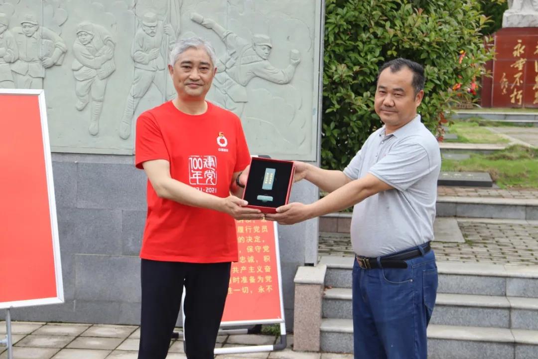 Cha Zhengwang presented a commemorative stamp from China Building Materials Group Corporation, "Run for a Century of Progress and Strive for a New Journey," to Zhang Jianglang, deputy director of the Shitai County Department of Veterans Affairs.