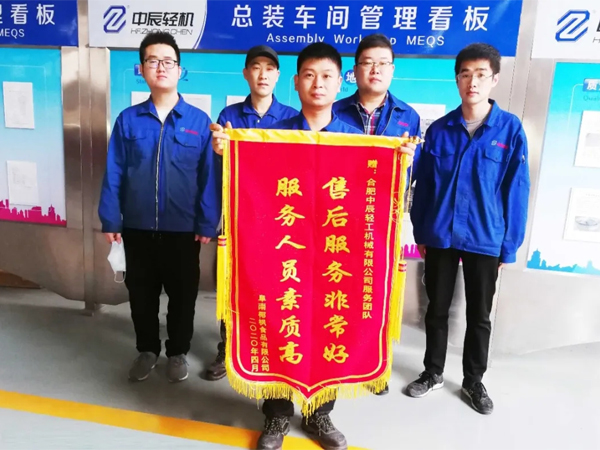 Recently, the assembly workshop of Zhongchen Light Machinery was once again praised by customers. The customer from Anhui Fuxin Coconut Fungus sent a flag of appreciation to the assembly workshop of Zhongchen Light Machinery, praising the outstanding performance of the service team led by Zou Jiahua in the after-sales service process of QCGN505010E filling, capping and sealing three-in-one machine and DBS185 mixer, and praising Zhongchen Light Machinery's "excellent after-sales service and high-quality service personnel".
